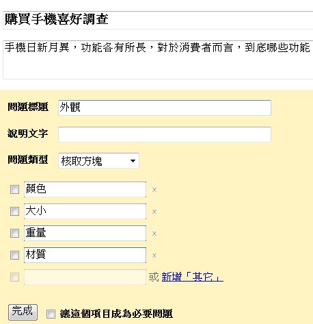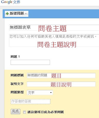 步驟三、分別輸入標題、主題說明、問題、問題類型,預設只有兩題,若要增加按上方「新增問題」在選定問題類型即可,每一題輸入完成,記得要按下方「完成」按鈕,整份問卷製作完成點選右上角「儲存」
